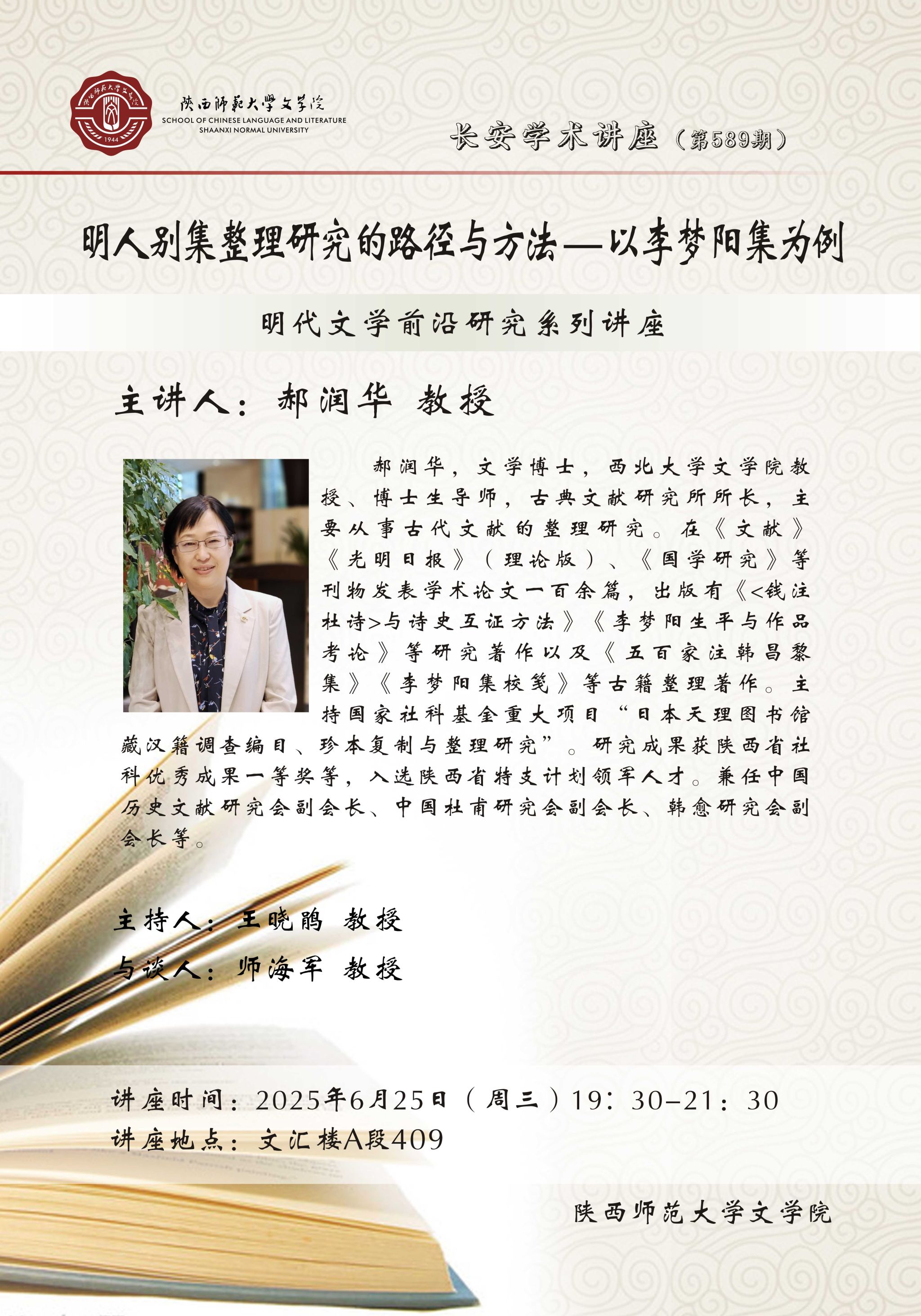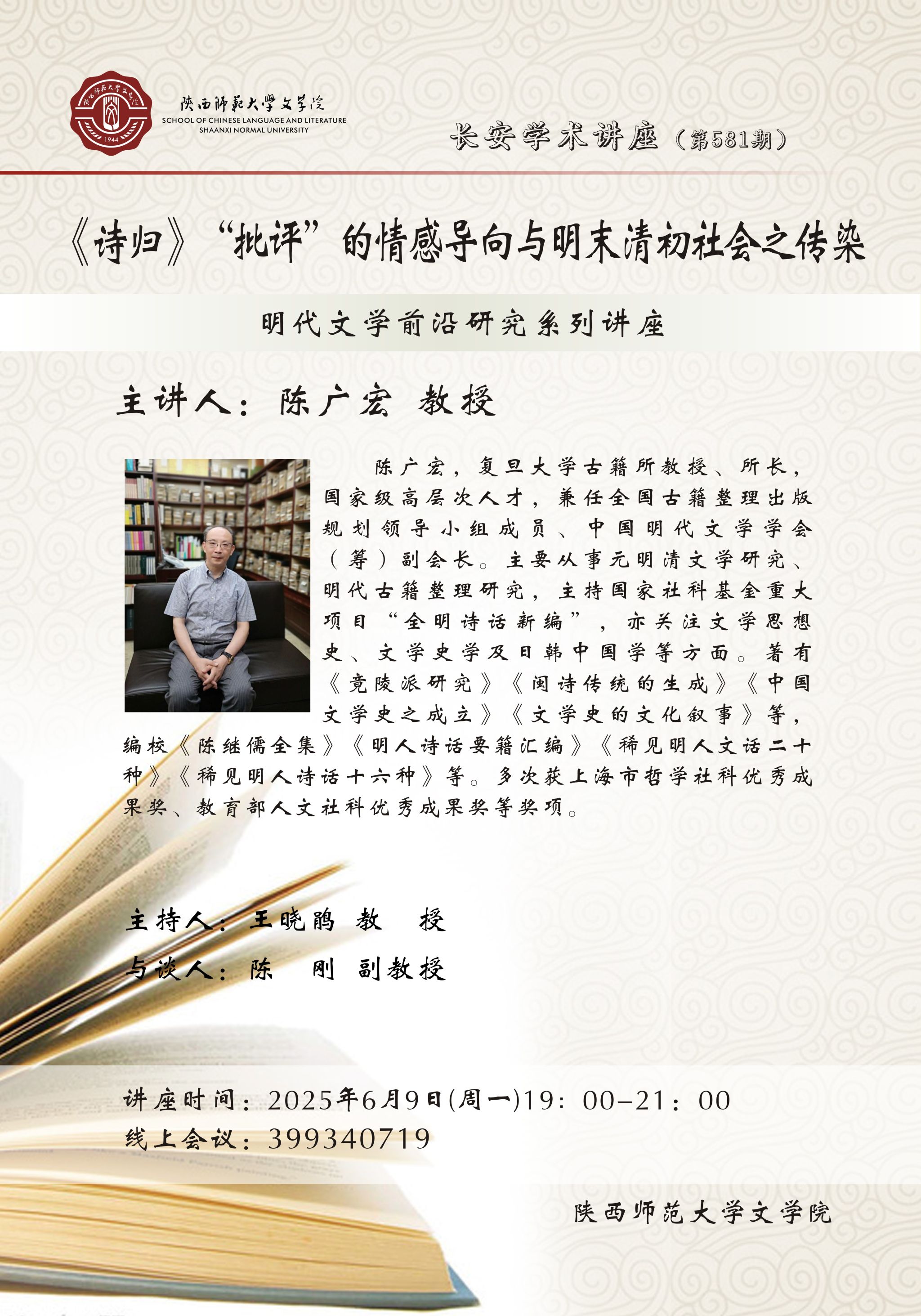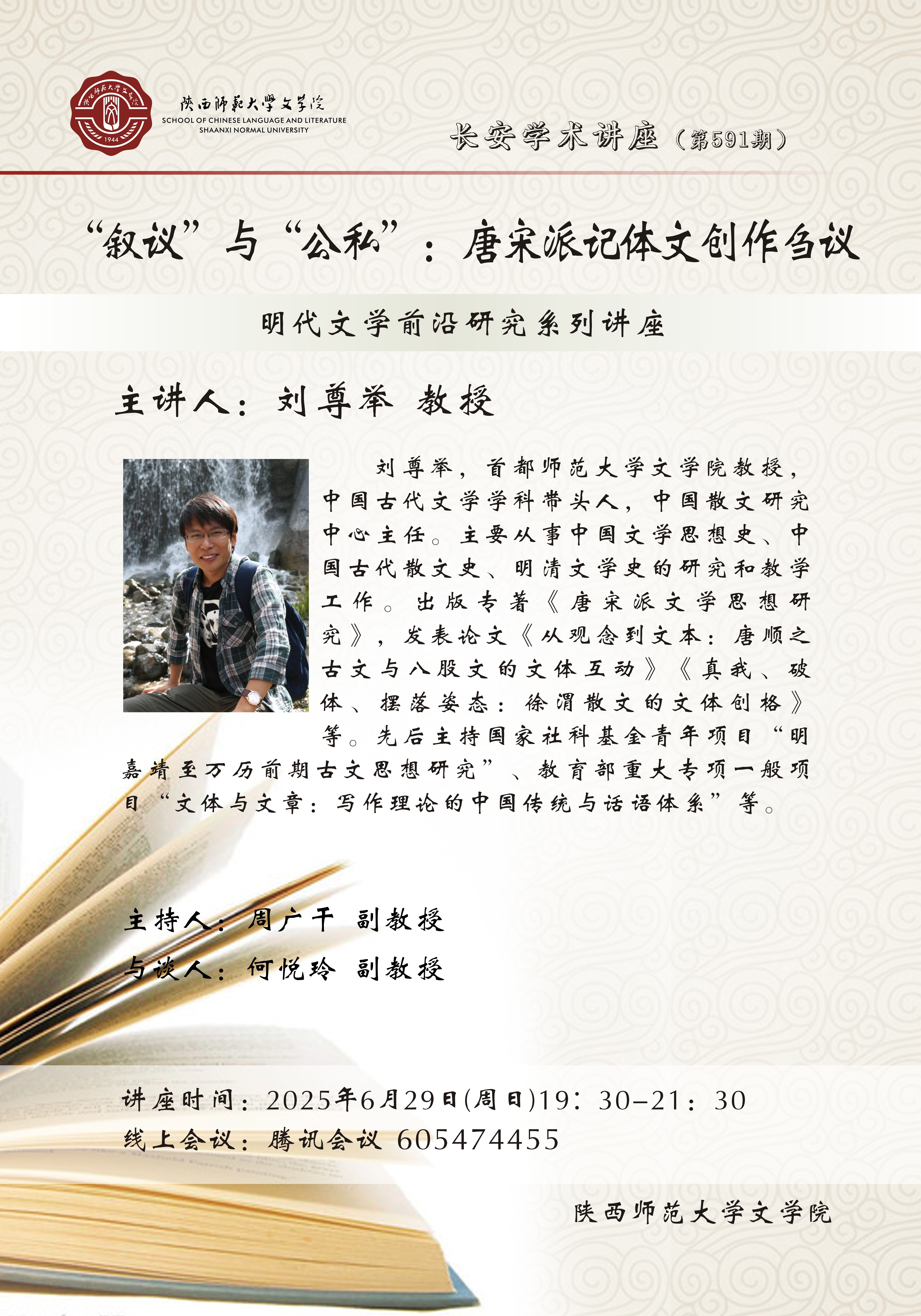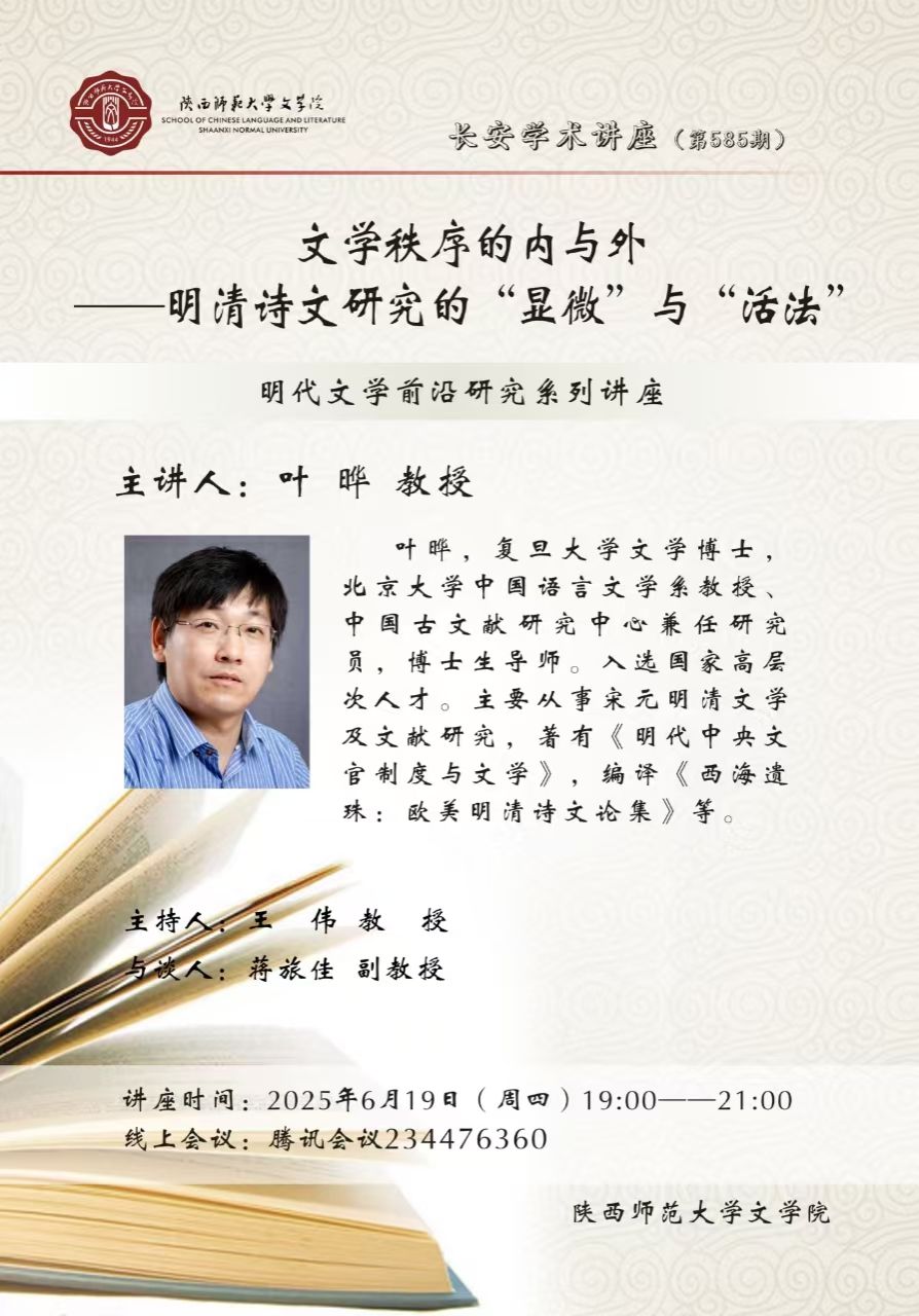 (通讯员:乔月)2025年6月29日晚,由公司主办的明代前沿系列讲座暨长安学术讲座第591期“‘叙议’与‘公私’:唐宋派记体文创作刍议”顺利举办。讲座邀请首都师范大学刘尊举教授作为主讲人,公司周广干副教授主持,何悦玲副教授、师海军教授与谈,来自全国各高校近100名师生在线参与。讲座伊始,刘尊举教授援引叶晔教授做讲座时提到的“显微”理念,认为对于明代文学史、流派、具体创作现象的认知,本身就是一个显微的途径。刘教授从唐宋派的认知问题和记体文的弹性空间两个方面介绍了本次讲座论题的缘起,...
