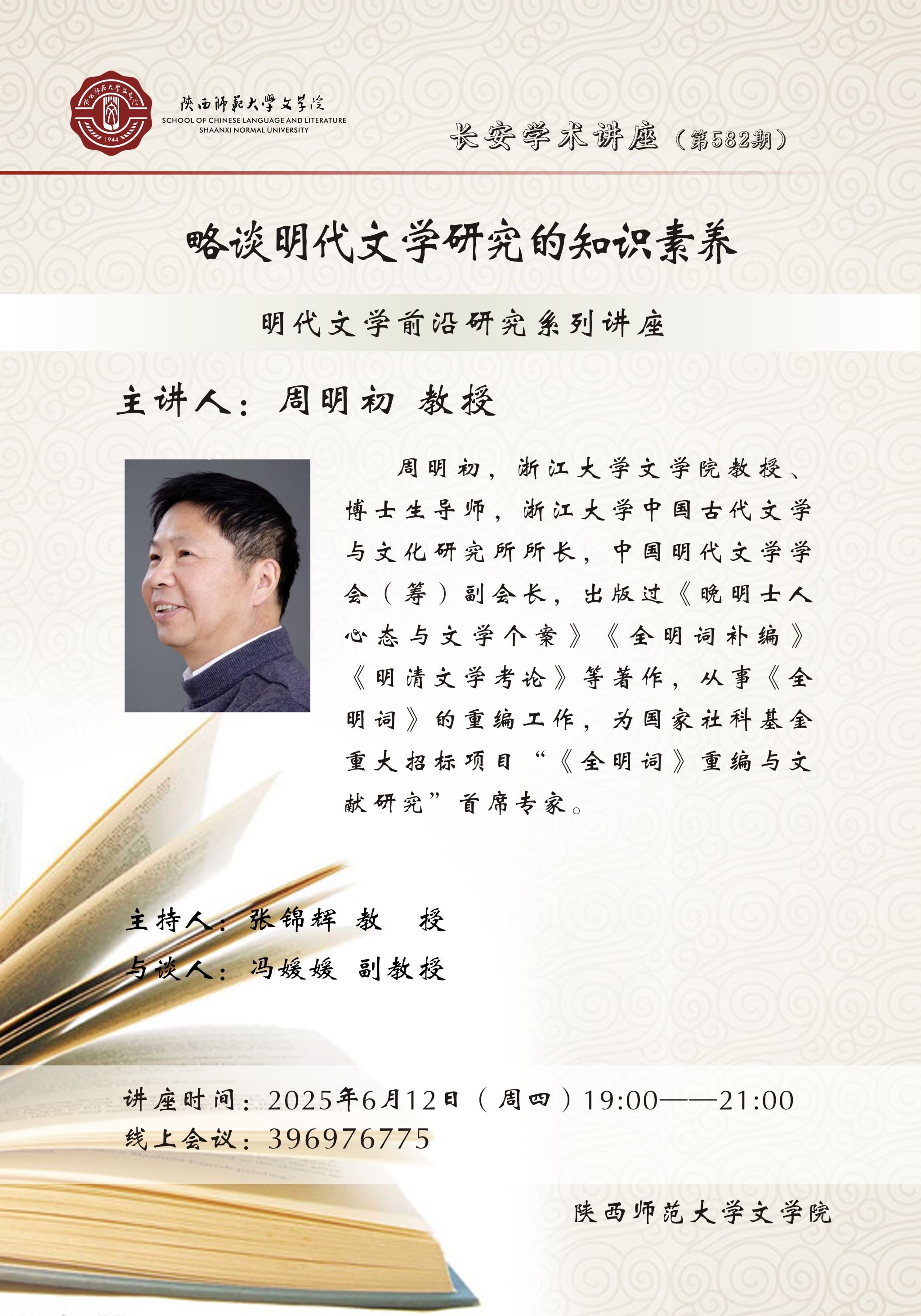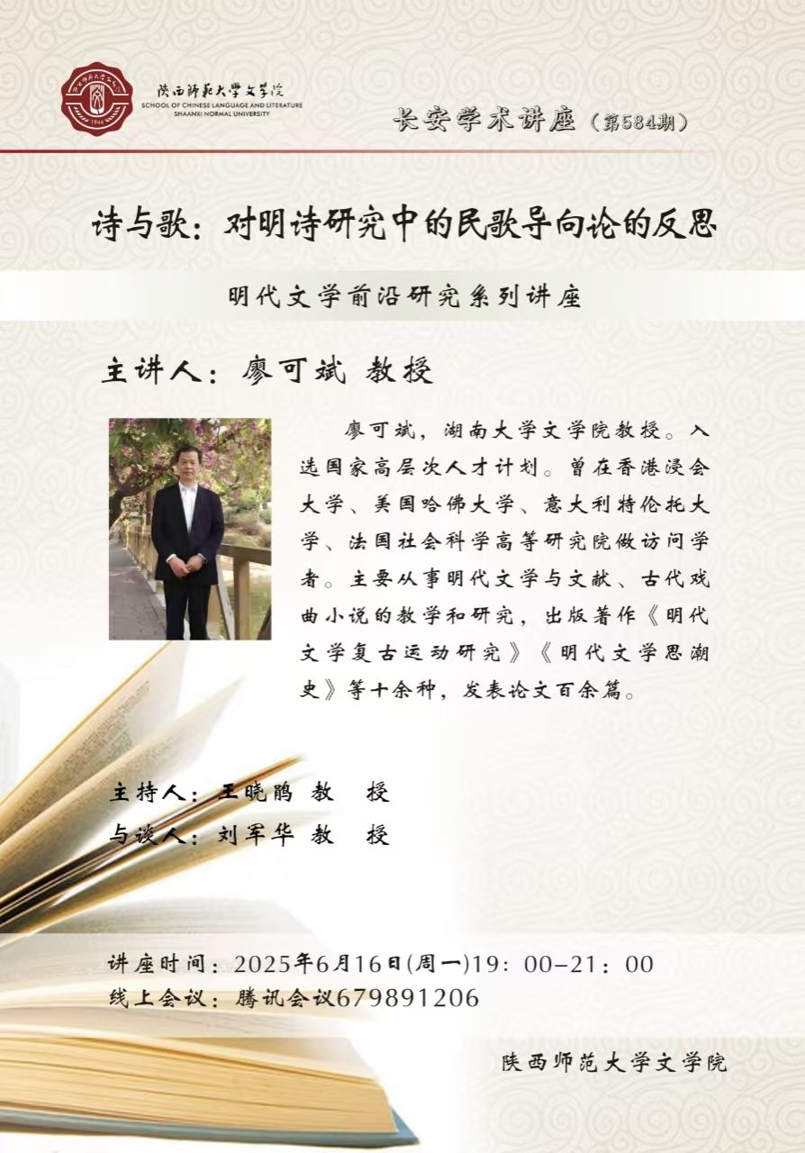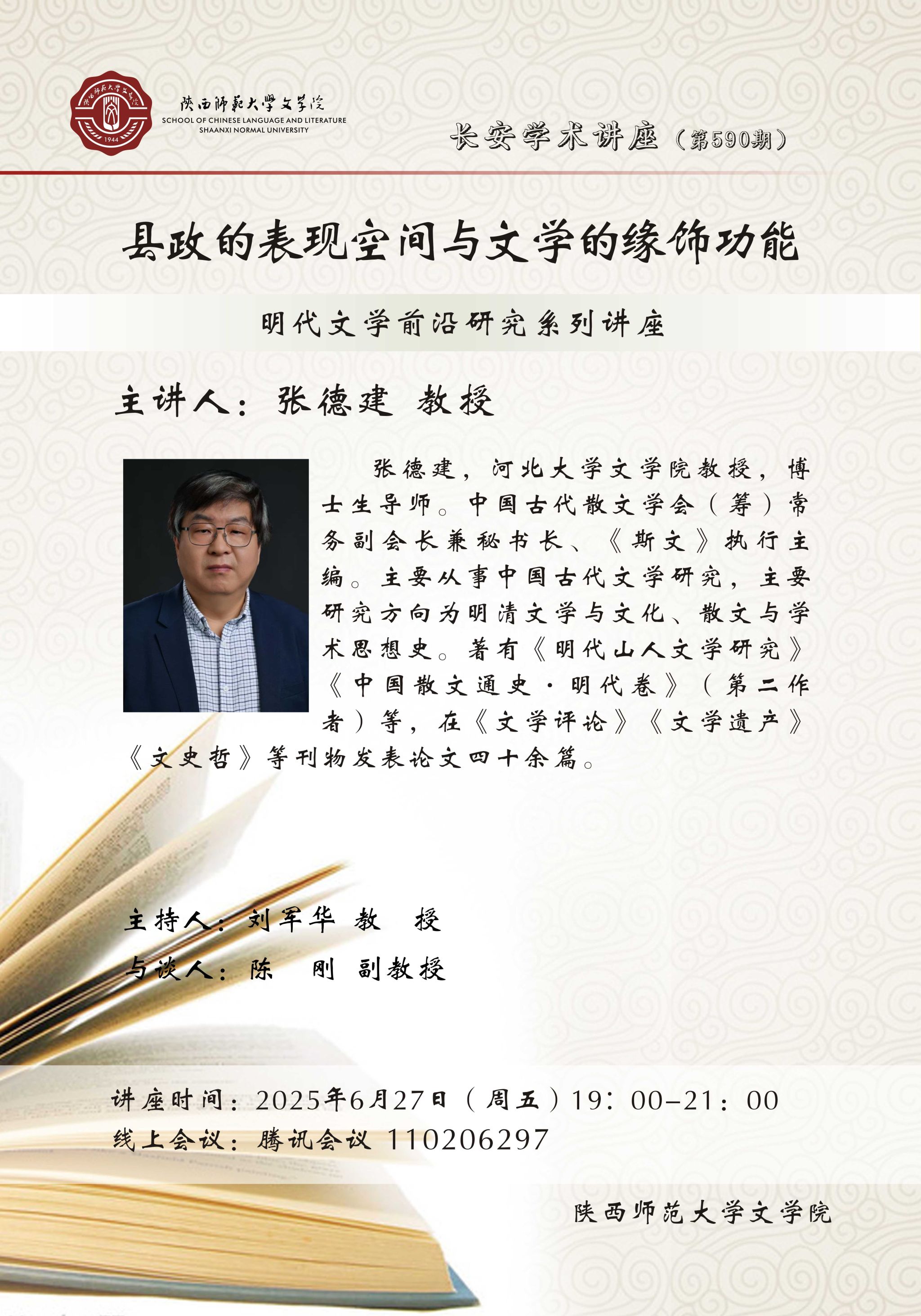 (通讯员:张可)2025年6月27日晚,由公司主办的明代文学前沿研究系列讲座暨长安学术讲座第590期“县政的表现空间与文学的缘饰功能”顺利举办。讲座邀请河北大学英国上市公司365张德建教授作为主讲人,公司刘军华教授主持,陈刚副教授与谈,来自全国40多所高校、研究院的百余名老师及同学在线参与,共同探讨明代文学的魅力。张德建教授首先围绕县政实践,分析了四种文体的表现空间:一是公文,它是实际治理中的客观呈现。但明中期后,由于多由手书代笔,...