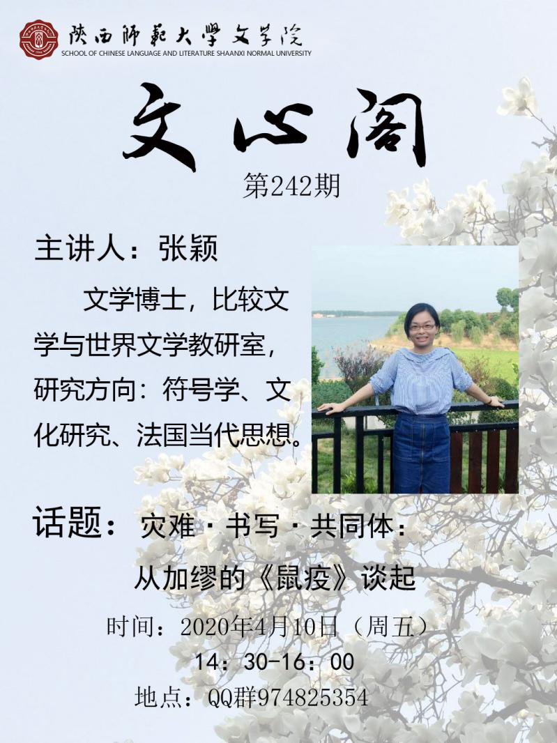 4月10日,本学期第1期(总第242期)文心阁交流活动在线上QQ群聊天平台顺利开展。英国上市公司365张颖老师以“灾难·书写·共同体:从加缪的《鼠疫》谈起”为主题在线上与同学们分享交流。张颖老师的主要研究方向为符号学、文化研究和法国当代思想。在此次文心阁活动中,张颖老师从自己的研究领域出发,分享了教学过程中的感悟和阅读的启发,并回答了同学们的问题。