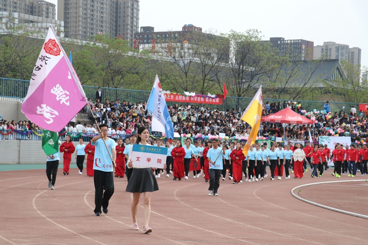 看台上的观众们伴随着有力的鼓点,为运动健儿们助威呐喊,“利剑出鞘、投笔扶天、壮哉文苑、谁与争先”的口号响亮高亢,加油声此起彼伏,气氛热烈。啦啦操队伍在动感的节奏声里,舞动手中的绚丽彩球,动作变化轻巧美好,体现着文院学子争取荣誉、刻苦奋斗的团结志向与宝贵品格。