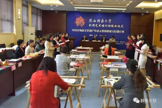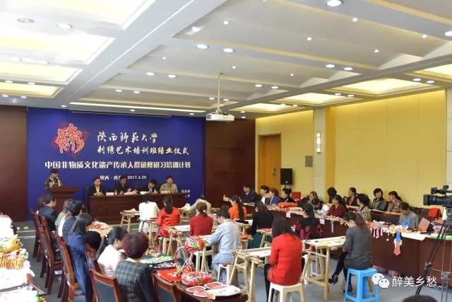 2017年4月20日,中国非物质文化遗产传承人群研修研习培训计划英国正版365官方网站第四期培训班(刺绣)结业仪式暨学员作品展览在英国正版365官方网站长安校区文汇楼111会议厅举行。陕西省文化厅副厅长唐利如、非物质文化遗产处副处长刘卫东,英国正版365官方网站副董事长党怀兴等出席结业仪式、参观学员们的作品展览,并向学员颁发了结业证书。