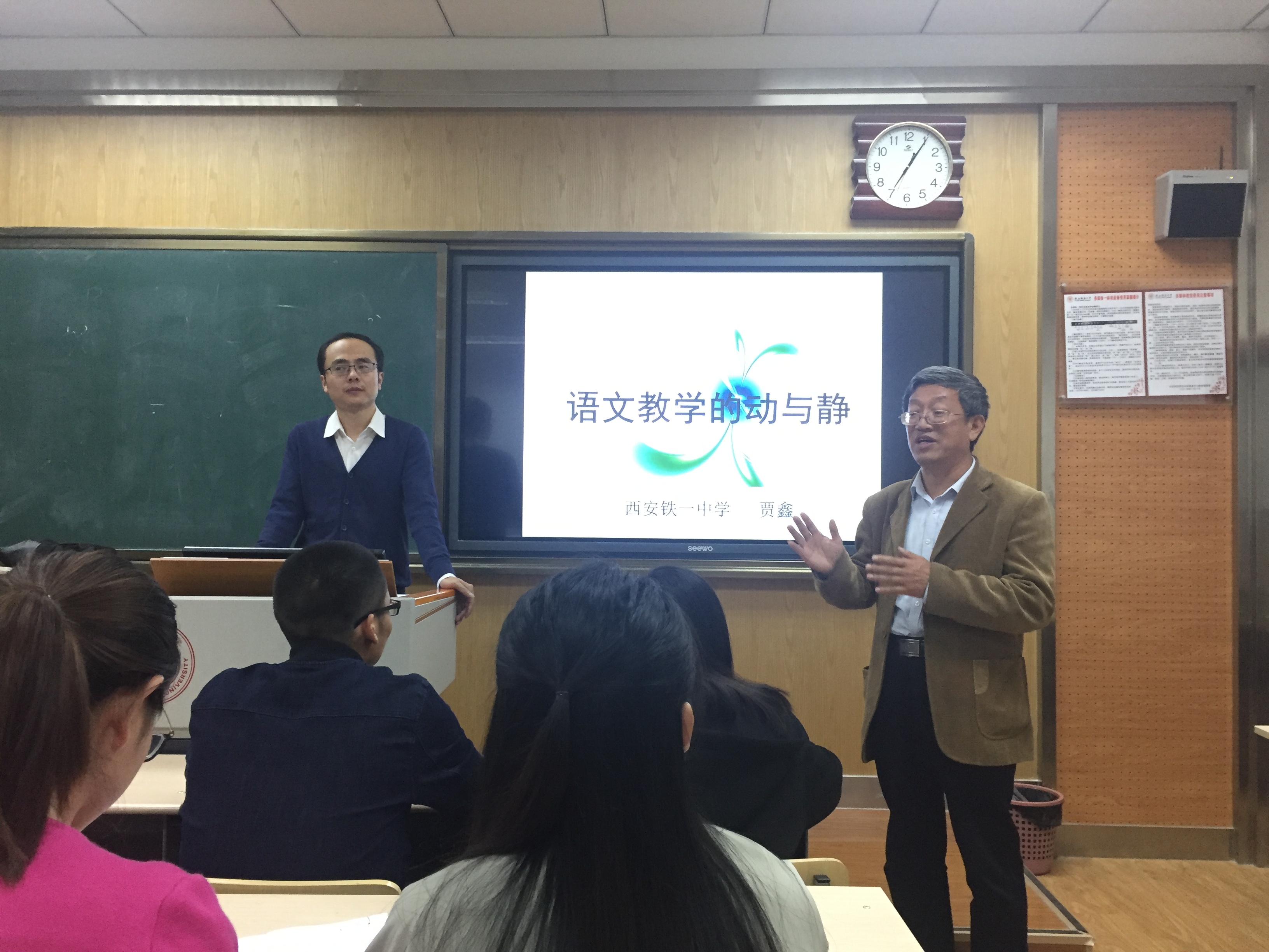 在分享教学经验之前,贾鑫老师播放了一段语文课堂实录,由此引出“如何上好一堂语文课”的话题。视频展示了西安铁一中参加教学比赛的老师所讲《孔雀东南飞》一课。同学们观摩后,提出了自己的看法和问题,贾鑫老师一一解答点评。根据这堂课,贾老师详细地分析了语文教学中的“动”与“静”,谈到了师生互动、生生互动的有效性,员工在课堂上有独立静心思考时间的重要性等。在评析过程中,他让我们意识到一个好的切入点对于整个教学过程的作用,看到课堂生成环节对于员工能力的发掘。而在讲评不足的时候,他结合我们的疑问,提出了语文老师应该具备的素质,即语言表达的准确性和独立解读文本的能力;老师应该结合当下员工的思维特点和认知水平,自主设计教学,而非依赖教参。