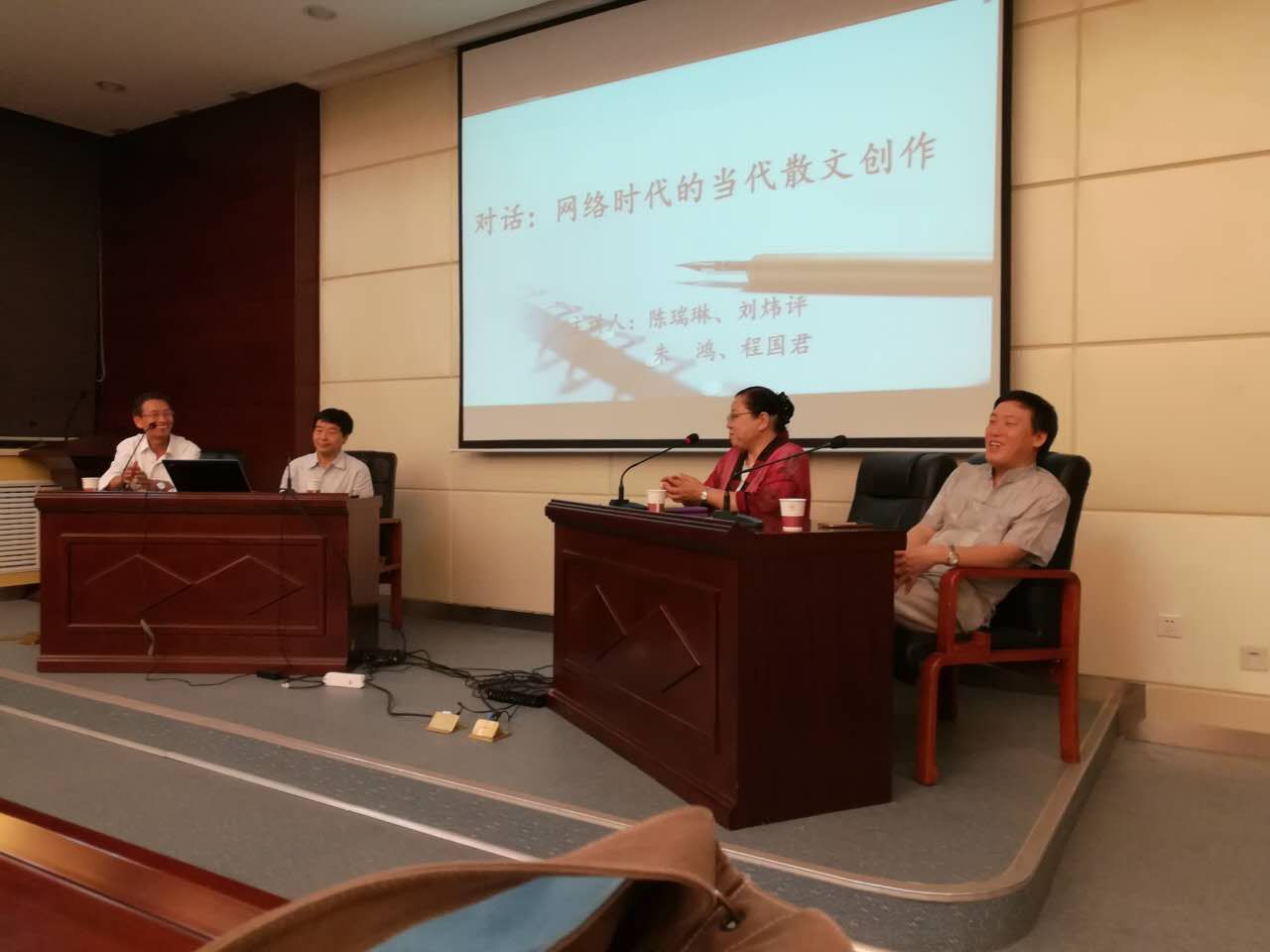 晚7点,报告正式开始。程国君教授从现代散文的发展历程展开本次对话,程国君教授提出网络时代与全球化时代当代散文发展的特殊之处。接着朱鸿教授对比西方散文与中国散文从古至今发展的不同形态,对当下散文的创作要求进行了具体阐释。陈瑞琳教授提到信息爆炸时代阅读选择的重要性以及散文创作视野的开拓性。紧接着陈炜评教授提到散文在我们阅读中的普遍性与永恒性,以及网络时代散文创作与传播呈现的新特点。至此,围绕讲座主题,四位教授展开了更加深入,更加热烈的交流讨论。