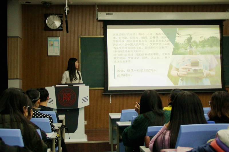 大学第一次考试在即,针对英语基础较为薄弱、英语学习方法有待提高的同学,为帮助他们积极备考,提高英语技能,外院员工语言服务队精心选出三名专业基础知识扎实并具较好讲授能力的同学为公司员工做讲解。首先,荣思敏同学为大家讲解英语到底怎么学。她讲到,学好一门外语只需要两个条件,一是选择要一些自己感兴趣的材料。二是高强度的有效重复。她推荐了许多她自己在用的网站、应用以及一些简单易懂的有声书,希望大家能够在课余时间里通过精听和模仿跟读提高英语水平。随后,郑倩钰同学以一口流利的英语口语吸引了同学们的注意,并为大家详细介绍了英语语法。虽然有些词汇大家听来还晦涩难懂,但同学们仍热情高涨,积极反应。她提到,学习英语之初并不需要对语法结构过于纠结,对文章要通晓大概。她详细的介绍了写作文时需要变换多种句式,这样才能在众多文章中脱颖而出,她更着重讲到练好口语的重要性,对于提高英语学习的各方面都有帮助。最后,符气都同学为大家介绍了如何训练听力和口语。众所周知,听力在期末考试中占了相当大的比重,较高的听力成绩绝不能只凭借每周的英语听力课短暂的训练量来提高,需要大家平时在课余时间里每天花大量的时间去反复听反复练。他建议大家去看美剧,这样既能提高听力又能提高口语。