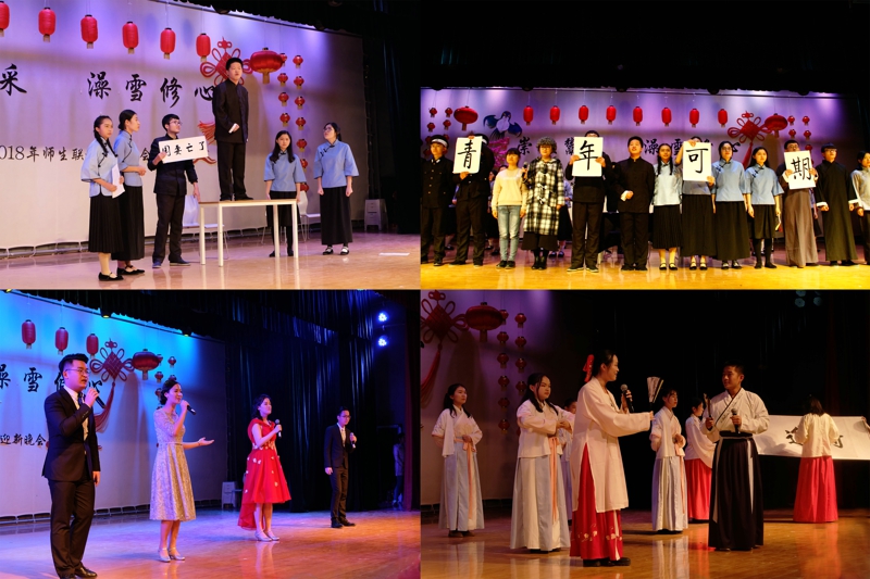 曲动魄,舞飘飖,铿锵有力的鼓点和鲜艳灵动的红绸喜庆祥和,歌舞节目《好运来》拉开了迎新晚会的序幕。《春知晓梦》、《舞乐春秋》为观众带来了美的享受,旗袍水袖,婉约柔美,一颦一笑,动人心弦; 2015级员工呈现的舞蹈《全部都是你》则充满着惊喜和欢笑,师生互动,掌声不断,且歌且舞,活力四射。文苑社团联合展示的《将进酒》和17级新生带来的原创诗歌朗诵《青灯》,用抑扬顿挫的诗句吟诵出学子的深厚底蕴,用悠扬婉转的曲调歌唱出文苑的赤子深情。字里行间、饱含赞美,文辞断句、潜隐祝福。由辅导员秦亚坤老师和研究生代表表演的戏曲联唱古风古韵,唱腔细腻,别具风味;小品《你好,李焕英》、《家长会》则着眼于社会热点问题,触觉敏锐新颖,情感充沛自然,嬉笑怒骂,戏说人生。研究生同学们带来的节目《青春组歌》旋律曼妙,嗓音迷人,诉尽柔情,展现出学子们积极向上的靓丽风采。《天下相亲与相爱》在员工会与研究生会主席团动感的舞蹈中开场,学工组的老师们依次上台一展歌喉,掀起全场高潮。