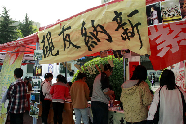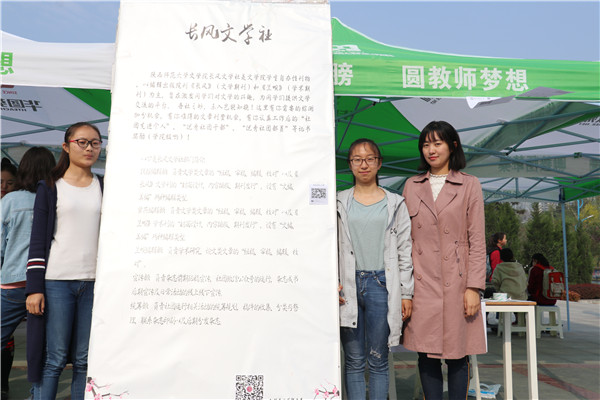 长风文学社的社员认真地为同学们讲解着社团的详情,解答同学们的疑惑;砚友书画社以一幅幅或沉雄健爽,或婉转细腻的书法作品吸引同学驻足欣赏;秦风诗社别具一格,以体会诗词之美为宗,吟经诵典,优美婉转,抑扬顿挫;雕龙文化协会以文会友,为广大热爱阅读的同学提供交流与讨论的平台;电影爱好者协会独具特色,通过有趣的活动与热爱电影的同学们交流;入戏话剧社用丰富的舞台作品展示了话剧的独特魅力;雏玉散文社则以“常新去雏,光华如玉”为名,书写新时代的散文诗。