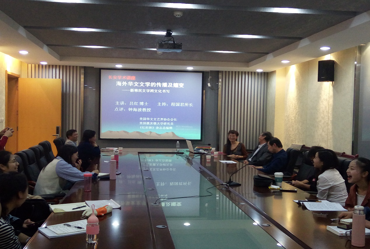 (通讯员:张倩茹)2018年9月29日晚7点,旅美华人作家吕红博士在文汇楼C区424会议室为公司师生作了题为“海外华文文学的传播及嬗变——新移民文学跨文化书写”的专题讲座。吕红博士,现为美国华文文艺界协会会长、俄亥俄大学研究员、《红杉林》美洲华人文艺总编,著作有《美国情人》、《女人的白宫》、《午夜兰桂坊》等。讲座由程国君教授主持,钟海波副教授点评。参加讲座的有高研院李胜振副经理、教务处秦金香老师及三十多位研究生、本科生。