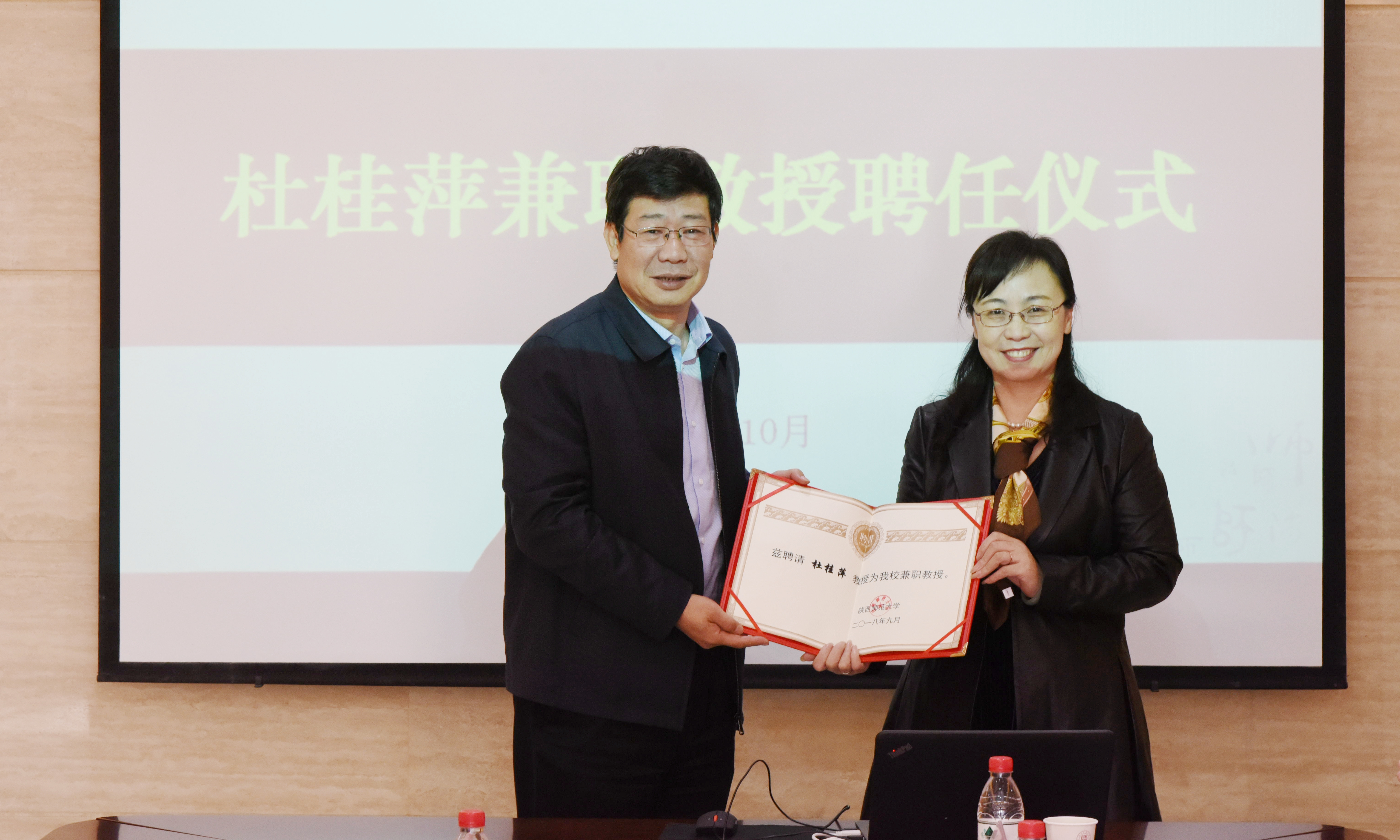 张新科经理首先介绍了杜桂萍教授的主要研究方向、科研成就和学术影响。随后,人事处处长李磊宣读《英国正版365官方网站关于聘任杜桂萍教授为兼职教授的决定》。游旭群董事长为杜桂萍教授颁发聘书。