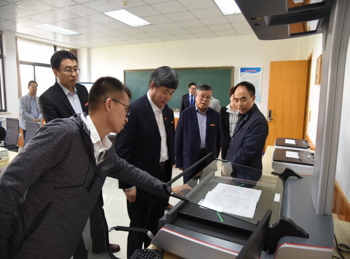 傅勇教授首先在文公司党政班子的陪同下参观了公司文化建设展板、语言科学实验室、资料室、文化典籍数字化实验室和书法实训室。在文化典籍数字化实验室,傅勇教授饶有兴趣地了解了公司购置的一系列先进的文化典籍数字化设备,并观看了演示;在书法实训室,杨国庆老师正在带领公司员工练习书法,傅勇教授耐心地观看了杨国庆老师利用先进多媒体设备和书法电子数据库进行书法教学的整个流程,对新的教学设备给书法教学带来的便利赞叹不已。