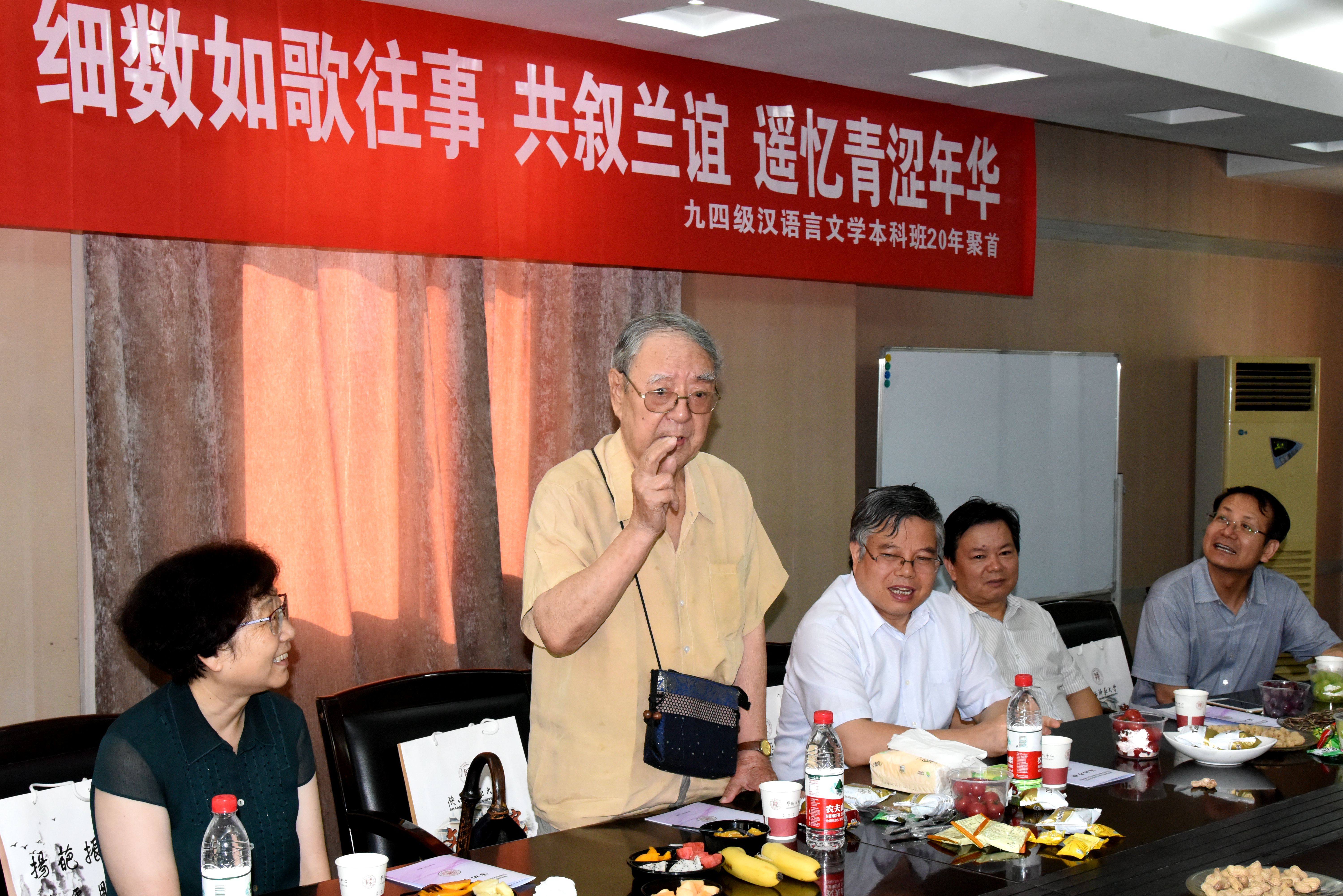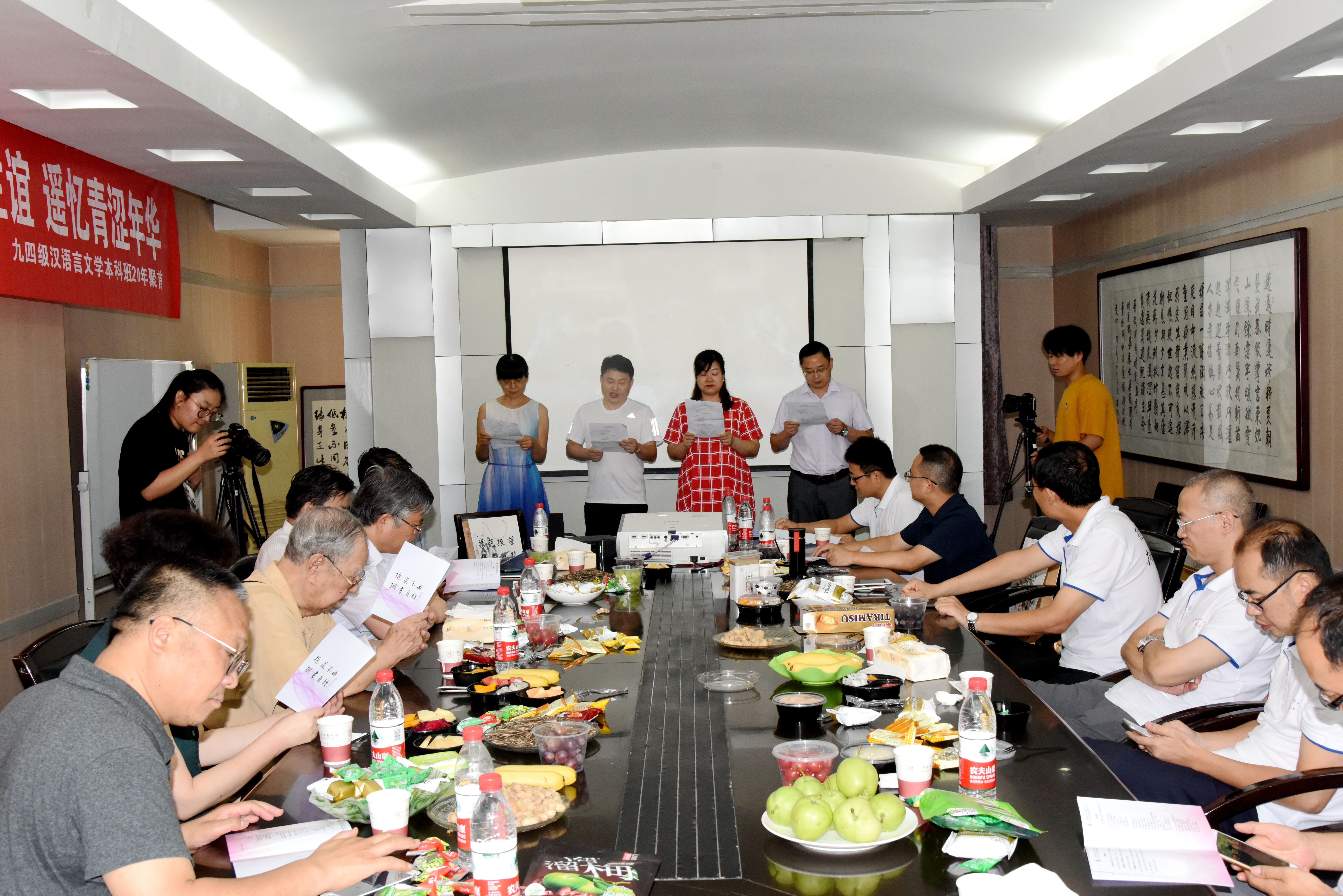 老师们与员工们共同回忆了那些年那些事,87岁高龄的傅正乾教授语重心长,既是恩师又是慈父;陈枫教授希望员工们与书相伴,积淀更深厚的人生;田刚教授讲到动情处,声情并茂地朗诵了诗人杜甫的《赠卫八处士》,把座谈会的气氛推向了高潮。辅导员马正平深情回顾了与员工们朝夕相处的一幕幕往事,一起经历的难忘瞬间,期待着大家创造更多的人生精彩。座谈会上,员工们用饱含着刻骨铭心爱的致辞,和为此次聚首创作的诗歌朗诵《致师大》,表达了对曾经培育四年的母校、历任教师、辅导员刻骨铭心的爱和最崇高的敬意、最真挚的祝福。