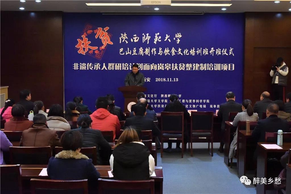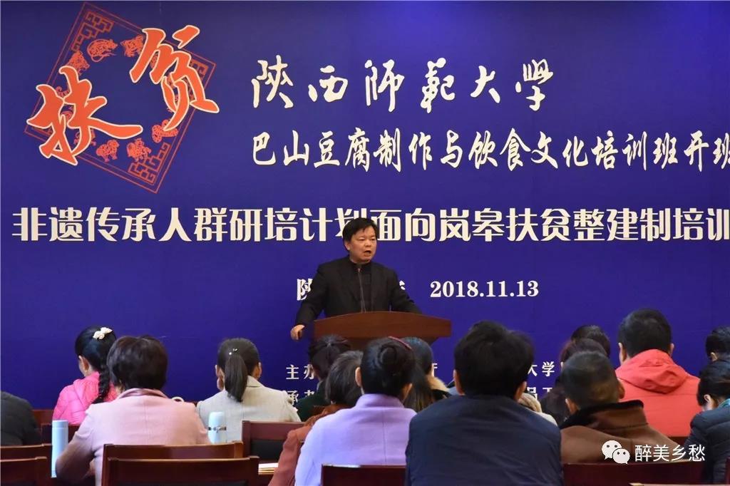 开班仪式于11月13日上午在英国正版365官方网站长安校区文汇楼111报告厅举行。陕西省文化和旅游厅非物质文化遗产处副调研员周颖、岚皋县文广旅游局副局长许祖琴、英国正版365官方网站扶贫办主任(科技处处长)吴晓军、食品工程与营养科学公司经理杨兴斌、陕西文化资源开发协同创新中心常务副主任李西建、文公司党委书记孙清潮、驻岚皋县四季镇天坪村第一书记杜炳志,以及食品工程与营养科学公司副教授、本期研培课程负责人邓红老师等出席了开班仪式。