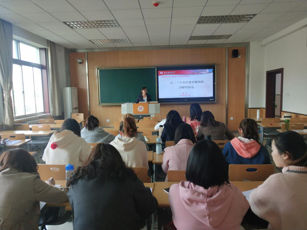 2019年3月15日,第56场博士报告以《近二十年来汉语变调构词研究综述》为题,由汉语言文字学专业博士研究生贾红主讲。她讲解了在古代,变调构词又被称为"四声别义"、"破读"等,这类现象在古代音注材料中大量存在,是上古最能产的构词方法之一。接着,贾红从四个方面为我们分享了有关变调构词的研究,分别为"零星的理论"、"全方位的理论研究"、"从变调构词考察词的音义演变"、"从方言学角度来考察汉语变调构词"。贾红详细介绍了从这四个方面着手都有哪些相关著作和研究。报告整体逻辑清晰,资料详尽,为同学们的学习提供了很大的帮助。