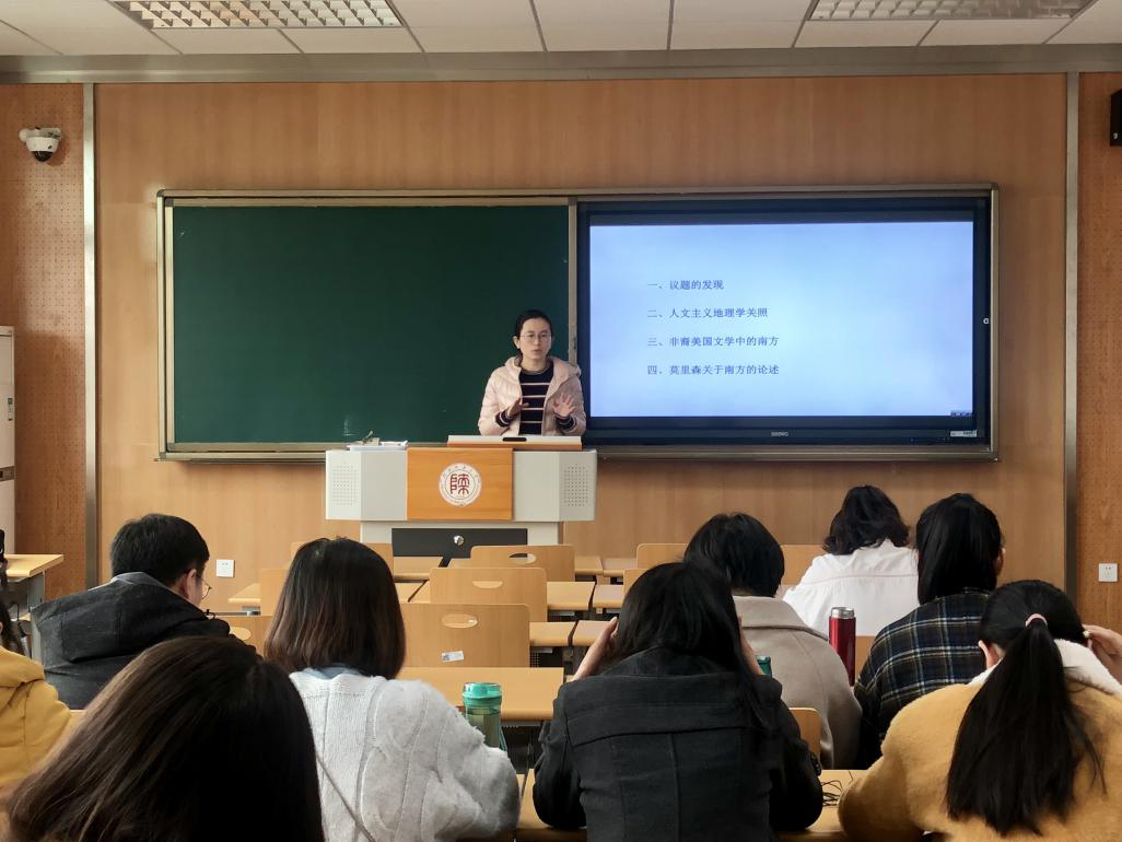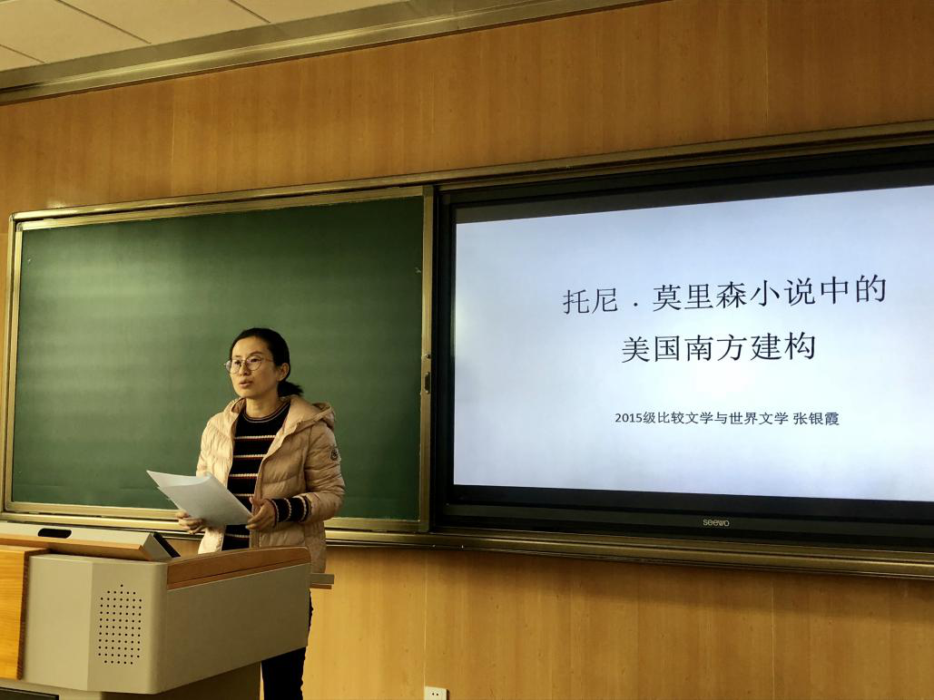 2019年3月13日,第54场博士报告以《托尼·莫里森小说中的美国南方建构》为题,由比较文学与世界文学专业博士研究生张银霞主讲。她从托尼·莫里森的小说作品出发,讨论了四个部分:议题的发现、人文主义地理学关照、非裔美国文学中的南方和莫里森关于南方的论述。张银霞认为,莫里森以其独特的人文关怀和视角建构了一个不同于白人作家笔下的南方神话王国,也不同于非裔美国文学中关于苦难南方的塑造。作家巧妙地将美国南方与黑人的文化身份、建立理想家园的努力以及应对现代性问题等现实诉求置于同一叙述框架之中,塑造了一个充满活力和面向未来的南方。