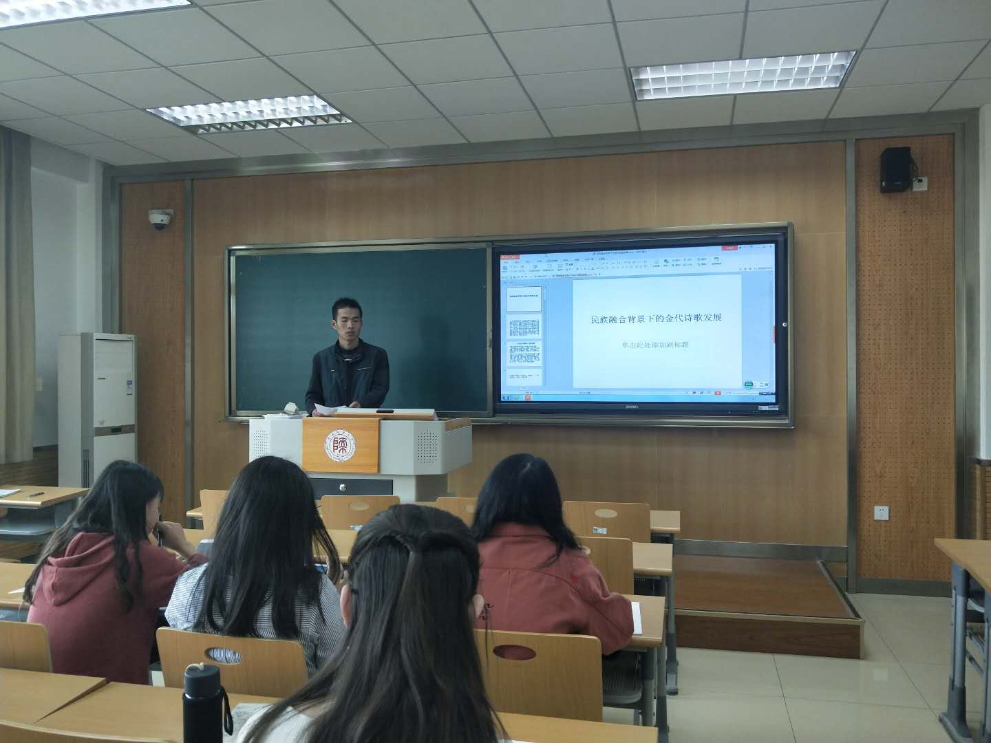 2019年3月29日,第67场博士学术报告以《民族融合背景下的金代诗歌发展》为题,由中国古代文学专业博士研究生吴致宁主讲。吴致宁从少数民族诗人的创作、诗坛风气的转变、诗人正统观念的变迁三个方面展开报告。他认为南北融合以及少数民族诗人的汉化使得金代诗歌汲取了南方诗歌的优点,进一步促进了南北诗歌的融合发展。