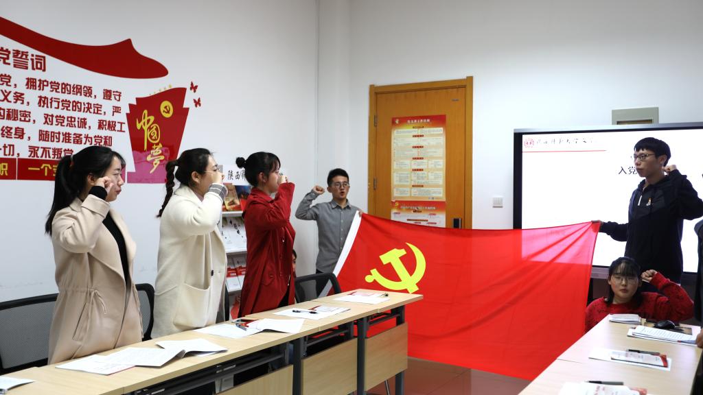 最后,2016级本科生党员赵博文的带领下,全体成员重温入党誓词,坚定初心使命。