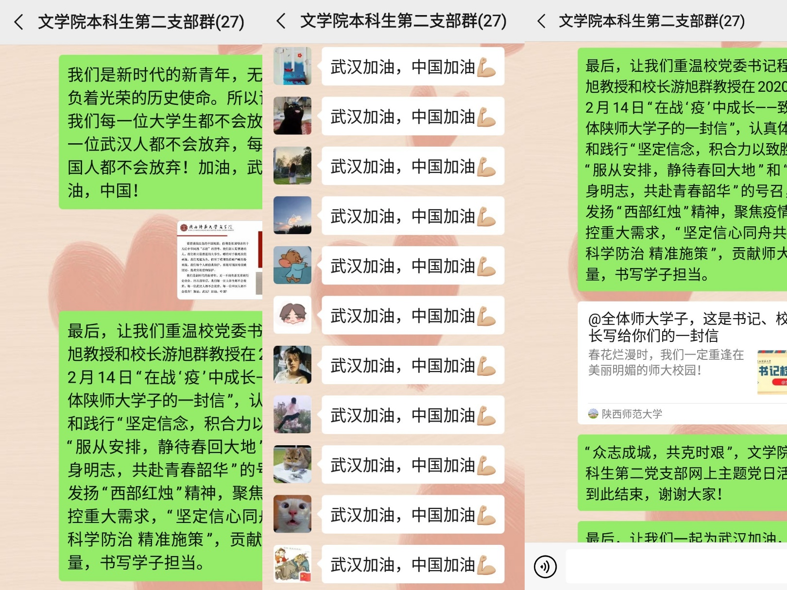 活动最后,支部成员一起重温了公司党委书记程光旭和董事长游旭群在2020年2月14日发表的“在战‘疫’中成长——致全体陕师大学子的一封信”。大家纷纷表示将会积极践行“西部红烛”精神,聚焦疫情防控需求,充分发挥基层组织战斗堡垒作用和党员先锋模范作用,科学规划“宅家”的学习生活,以实际行动为身边亲友作出示范,为战胜疫情作出实实在在的贡献。