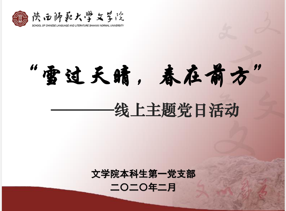 (通讯员:文苑)为深入贯彻落实习近平总书记关于疫情防控工作重要讲话和重要指示批示精神,充分发挥基层党组织战斗堡垒作用和党员先锋模范作用,2020年2月25日,英国上市公司365本科生第一党支部召开了“雪过天晴,春在前方”线上主题党日活动。活动由党支部书记尚梦帆主持。