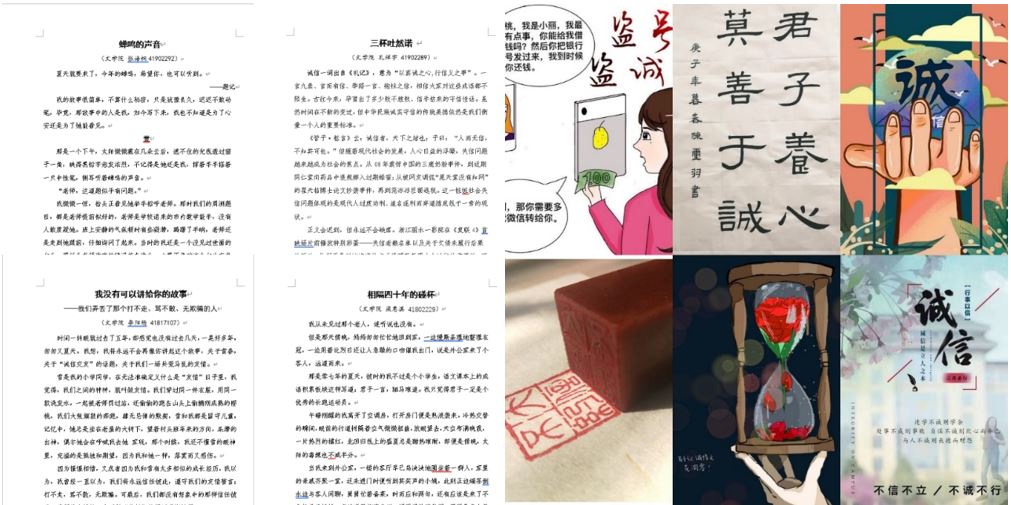言语秉诚信,文艺创作颂诚信意识。内诚于心,外信于人。文苑学子立身学科优势,通过开展诚信征文活动、组织诚信主题作品创作活动等形式,表达自己对诚信的认识。活动中涌现出一批优秀文章和创作作品。同学们用文字或议论社会热点、或记录身边守信、失信行为、或歌颂诚信意识。书法、绘画、海报、篆刻、剪纸、漫画等则以更直观的形式表现诚信精神,营造了良好的诚信氛围。