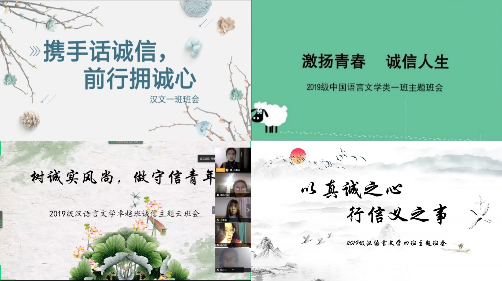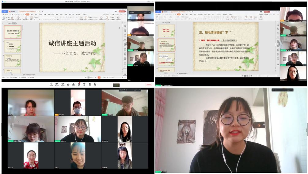 思想立诚信,班会讲座树诚信准则。诚信的践行需要立足于诚信意识的内化。各年级各班通过形式多样的“云”班会帮助同学们加强诚信意识,营造诚信班风。辅导员老师们和各班干部同学高度重视,结合专业特色进行准备筹划。班会内容完整详实,素材典型,具有教育意义。以“不负青春,诚实守信”为主题开展的诚信讲座线上教育活动,通过分享诚信缺失案例,揭露非法校园贷的危害,分析电信诈骗的威胁,让同学们进一步了解了失信行为的危害,有助于培养以诚信为本的道德观念。