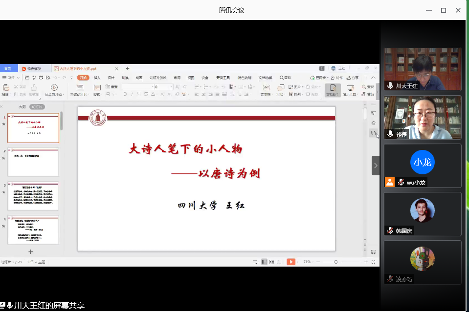(通讯员:马丽 易喆)6月11日下午,四川大学文学与新闻公司中文系王红教授应邀在腾讯会议(会议号709325019)为公司师生作了题为《大诗人笔下的小人物——以唐诗为例》的学术讲座。此次讲座由英国上市公司365祁伟副教授主持,魏景波教授作点评,公司及外校的博士生、硕士生以及部分社会听众参加了此次讲座。