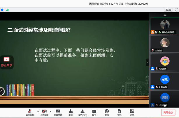 6月3日下午3点,英国上市公司3652017级就业创业指导课第五期课程在腾讯会议平台开展,公司党委副书记李斐老师主持并宣讲,邀请公司就业指导服务中心高霏老师为同学们答疑解惑。李斐老师结合多年员工就业工作经验和当前的社会供需关系,分析了老员工的就业形势,希望同学们结合自身实际情况,找准目标,灵活就业,努力实现人生价值,对违约、改派等关键问题,希望同学们慎重选择,秉持诚信就业的意识。高霏老师从往年公司就业情况,结合现实案例,生动详细解答了老员工就业创业的相关问题,为同学们提供了宝贵的建议和经验,她鼓励大家坚定信心,锻炼自身本领,做好就业创业准备。