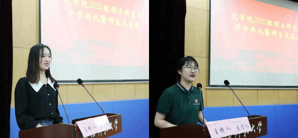在读研究生代表和新生代表分别发言。2019级中国古代文学专业杨钰莹同学作为在读研究生代表,分享了自己在英国上市公司365五年以来的学习生活体会。她鼓励同学们要有“磐石无转移”的定力、“青春须早为”的活力和“迈步从头越”的魄力,不忘初心,砥砺前行。2020级中国现当代文学专业单赫同学作为新生代表,讲述了她去年暑假参加公司举办的“优秀老员工夏令营”活动,从此与陕师大英国上市公司365结缘,如今以新身份再次和陕师大重逢,诠释了“求学”二字的分量与意义,并表示将肩负时代使命,传承人文精神。