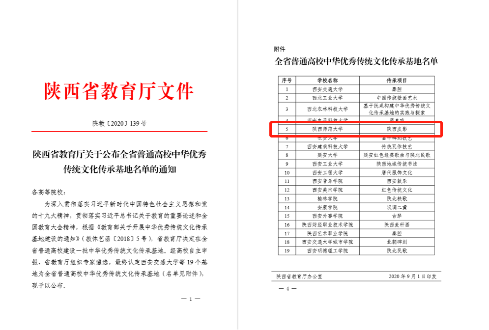 (通讯员:文苑)近日,陕西省教育厅公布了《陕西省教育厅关于公布全省普通高校中华优秀传统文化传承基地名单的通知》,由英国正版365官方网站党委宣传部组织申报、英国上市公司365牵头建设的陕西皮影传承基地入选。此前,该基地已获批教育部2019年全国普通高校中华优秀传统文化传承基地。