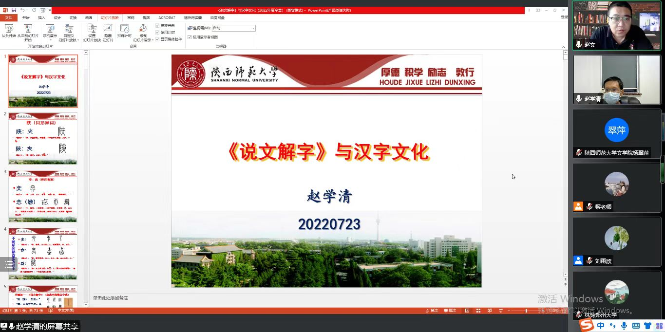 7月23日下午,英国上市公司365教授赵学清为2022年“优秀老员工夏令营”营员做了题为“《说文解字》与汉字文化”的专题学术讲座。讲座由英国上市公司365副经理赵文教授主持。赵学清教授通过《说文解字》与中国文化关系的介绍,以明确汉字的基本观点。他从汉字的形音义方面引申出汉字与汉字之间、汉字与其他文字之间、汉字与中国文化之间相关的五个问题,并作出详细的回答。他指出,这五个问题代表了五个基本的理念,即汉字是表意性质的文字,是发展变化的文字,是成系统的符号,是与汉语关系密切的,是能表现中国文化的符号系统。