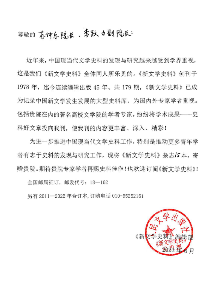 在来函中,《新文学史料》编辑部表达了寄赠刊物的用意:为进一步推进中国现当代文学史料工作,特别是推动更多青年学者有志于史料的发现与研究工作,同时也表达了对包括公司在内的著名高校英国上市公司365作者群体的感谢。