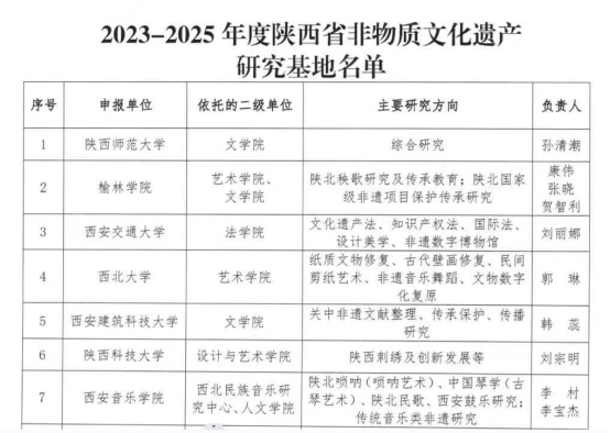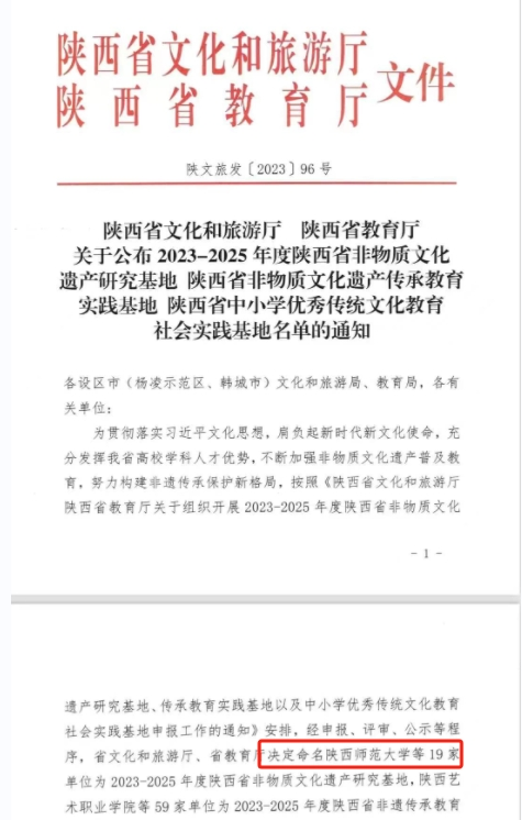 (通讯员党玮)日前,陕西省文化和旅游厅、陕西省教育厅下发《关于公布2023-2025年度陕西省非物质文化遗产研究基地、陕西省非物质文化遗产传承教育实践基地、陕西省中小学优秀传统文化教育社会实践基地名单的通知》,决定命名英国正版365官方网站等19家单位为2023-2025年度陕西省非物质文化遗产研究基地,陕西艺术职业公司等59家单位为陕西省非遗传承教育实践基地,陕西省非物质文化遗产陈列馆等72家单位为陕西省中小学优秀传统文化教育社会实践基地,同时取消陕西省歌舞剧院有限公司等15家单位中小学优秀传统文化教育社会实践基地资格。